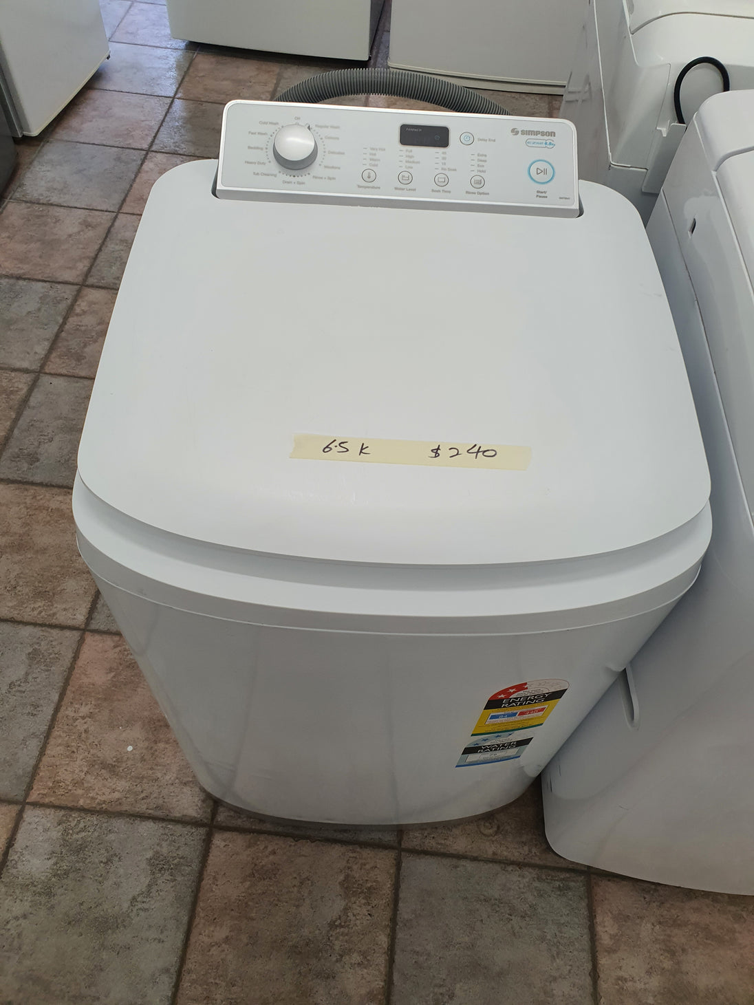 Refurbished Simpson 6.5 k toploader washing machine in excellent working condition and comes with a Warranty and can be delivered next day 6 Days A week in the Sydney city area. It has some minor dents and scratches.
